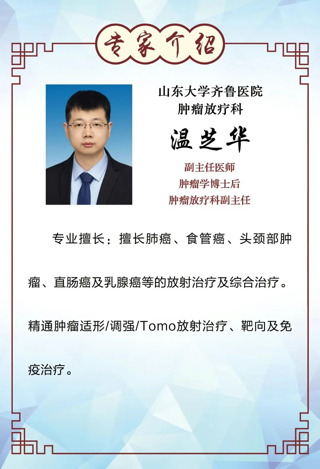 山东省齐鲁医院 温芝华 坐诊科室:肿瘤科 坐诊时间:1月14日下午14:30-17:00 咨询热线:0539-4821586