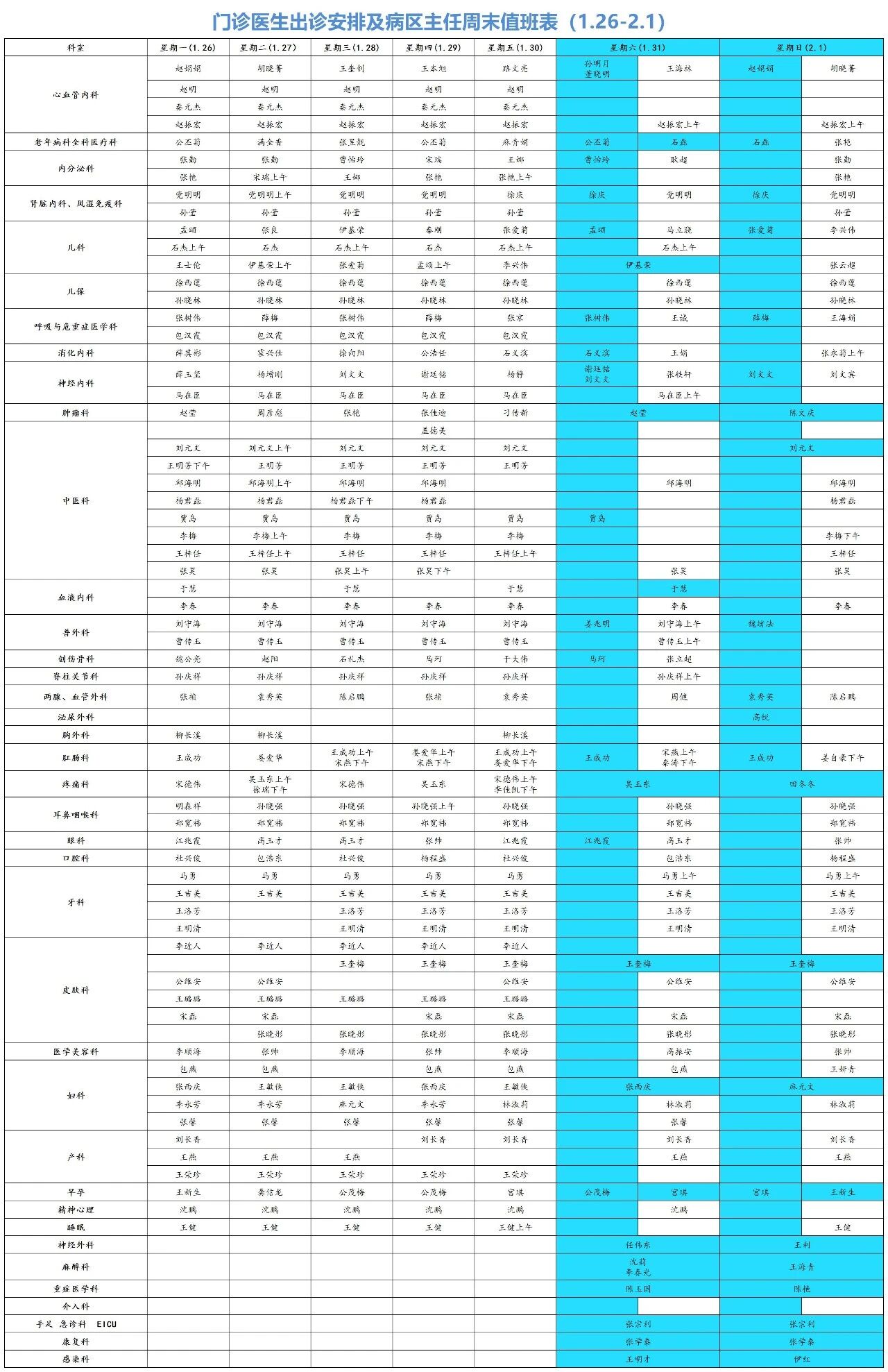门诊医生及科室主任周末出诊时间表如下图