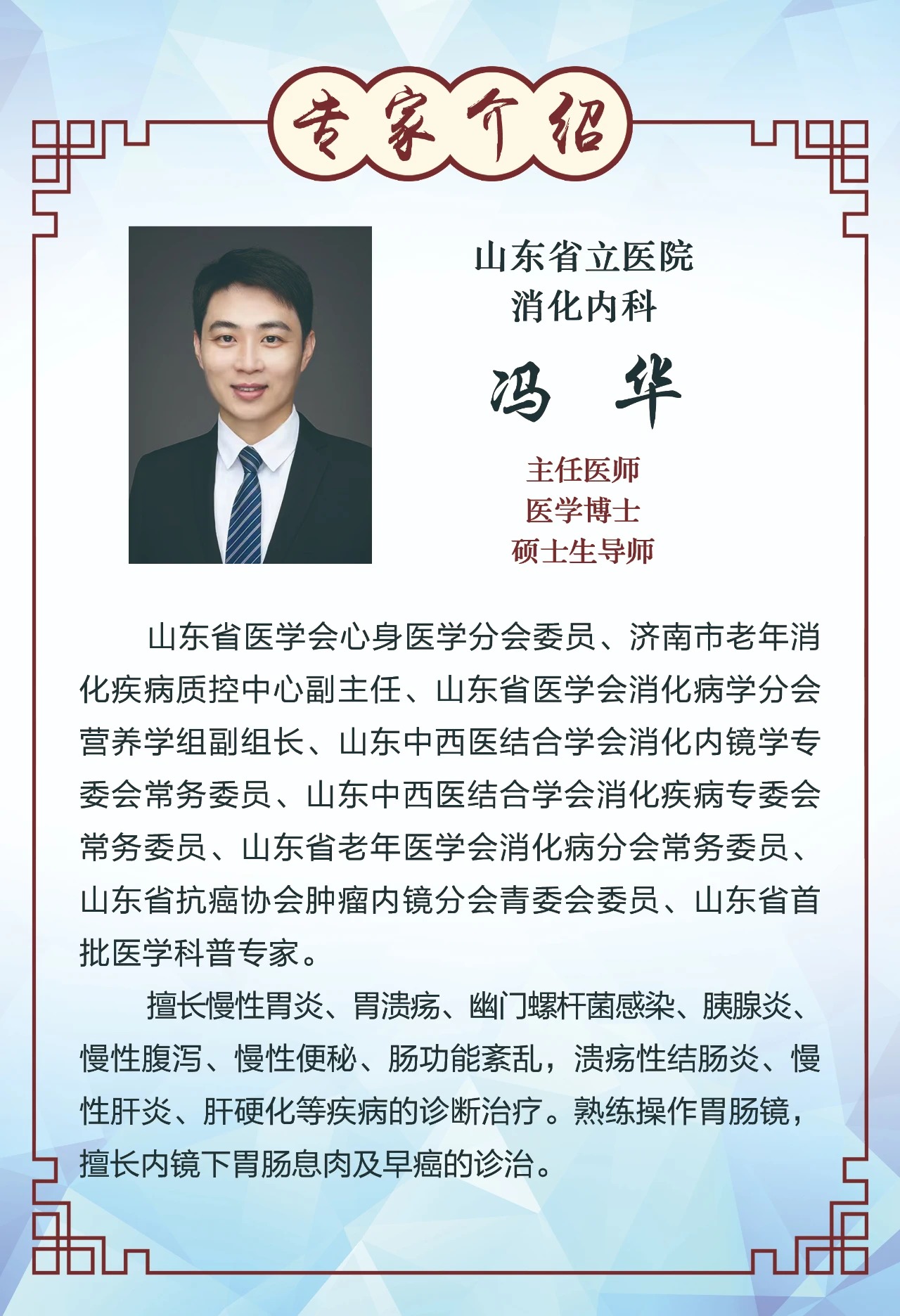 山东省立医院 冯华 坐诊科室:消化内科 坐诊时间:1月30日上午9:00-12:00 咨询热线:0539-4821809 15266659299(李主任) 坐诊地址:A楼14楼东区消化内科病区