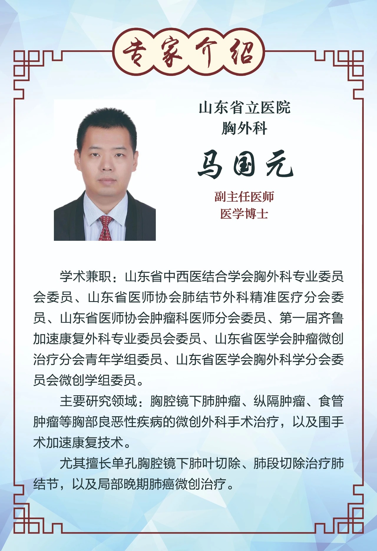 山东省立医院 马国元 坐诊科室:胸外科 坐诊时间:12月20日上午9:00-12:00 咨询热线:0539-4821795 18763706255(柳主任) 坐诊地点:A楼2楼西区胸外科门诊