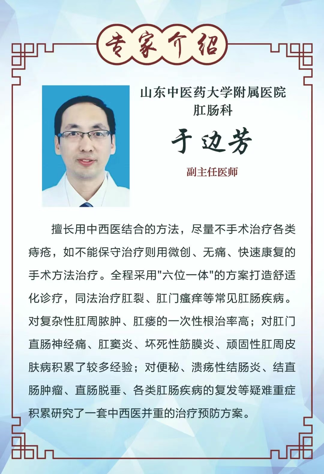 专家医讯丨1月26日,山东中医药大学附属医院肛肠科专家于边芳教授来院坐诊