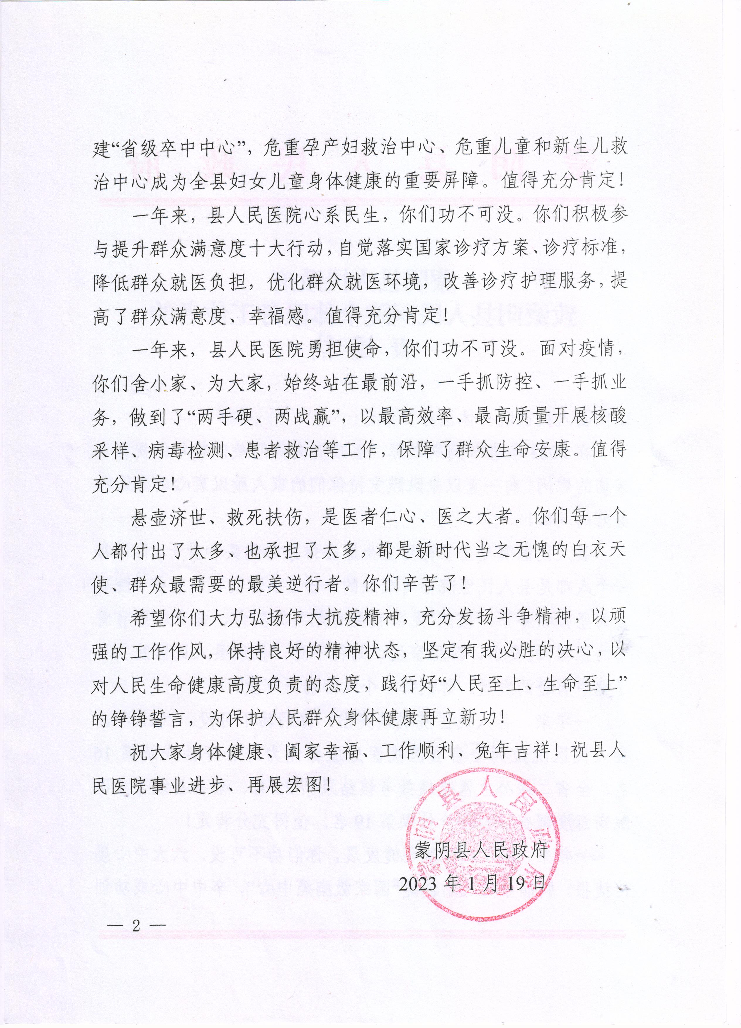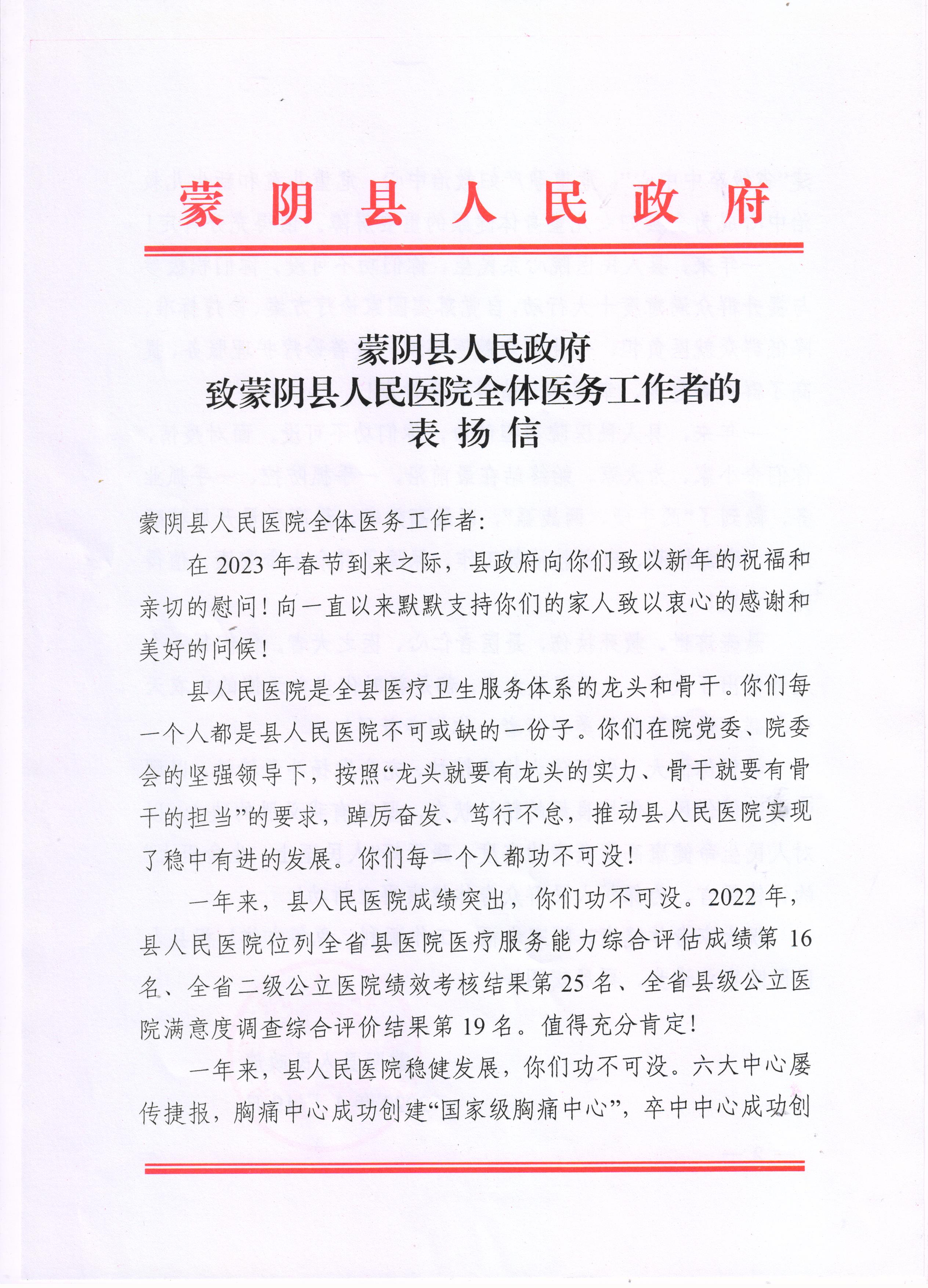 蒙阴县人民政府致蒙阴县人民医院全体医务工作者的表扬信