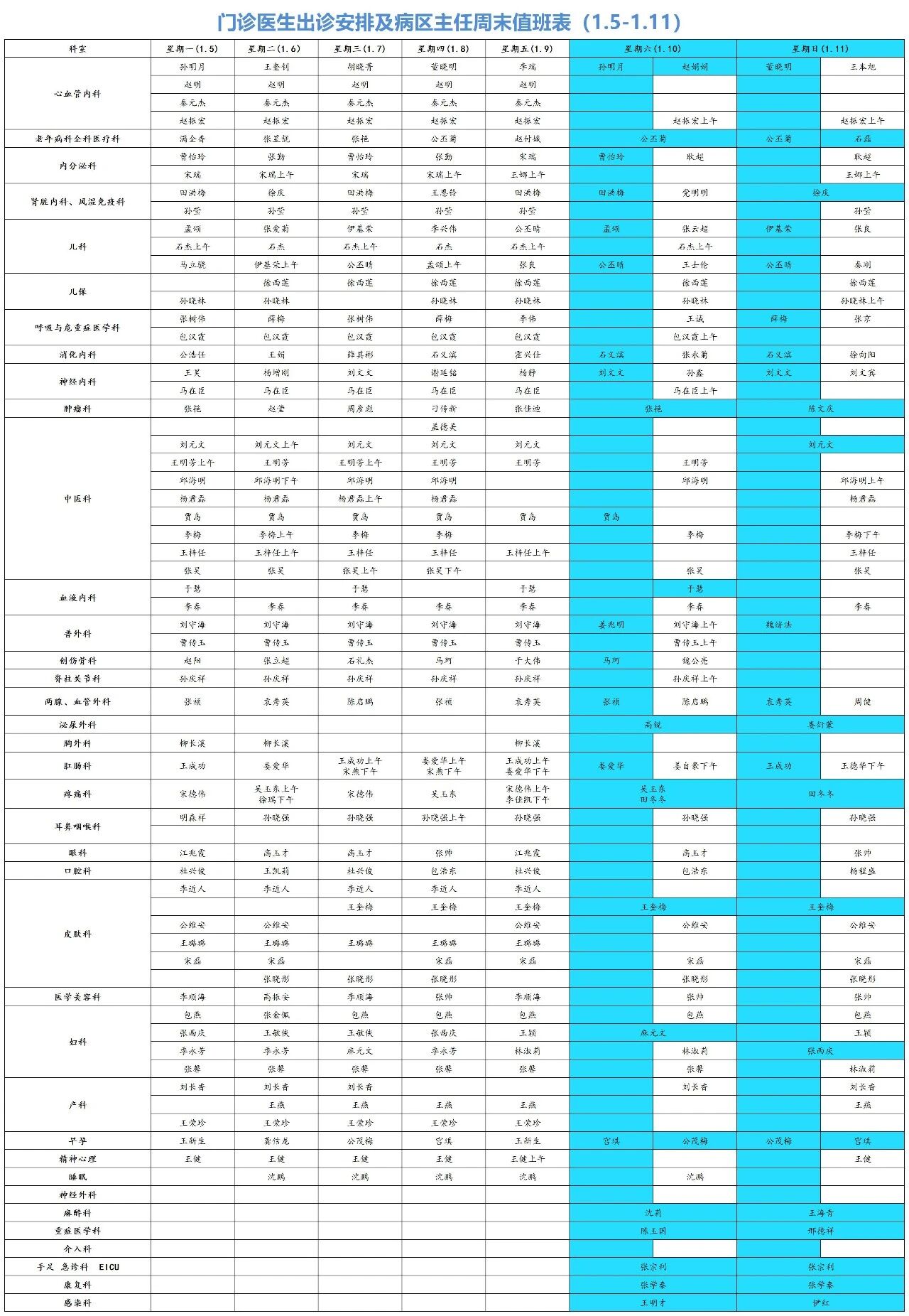 门诊医生及科室主任周末出诊时间表如下图