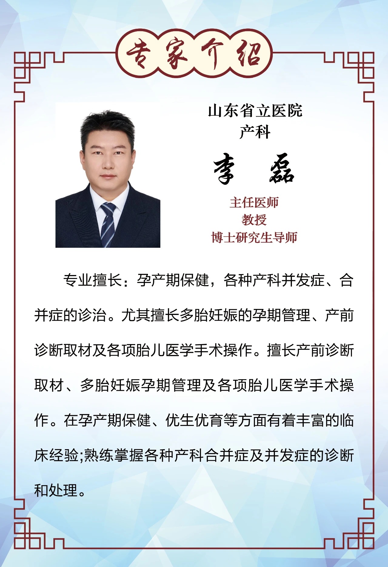 山东省立医院 李磊 坐诊科室:产科 坐诊时间:1月15日上午8:30-12:00 咨询热线:0539-4821505 18265960957(龚主任) 坐诊地址:A楼9楼东区产科病区
