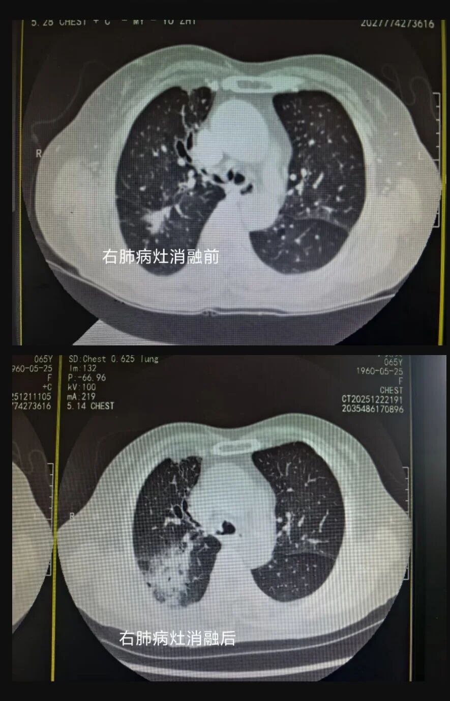 手术由危志刚教授与县医院胸外科副主任柳长溪共同协作完成。凭借丰富的临床经验和娴熟的操作技术,团队仅用半小时便顺利完结消融。术中患者生命体征平稳,未出现出血、气胸等并发症,体表仅留微小穿刺点,真正达到了微创治疗的效果。术后在胸外科医护团队的精心治疗护理下,患者恢复顺利,2小时后即可进食并下床活动,复查胸部CT显示消融范围完全覆盖病灶,手术效果显著。